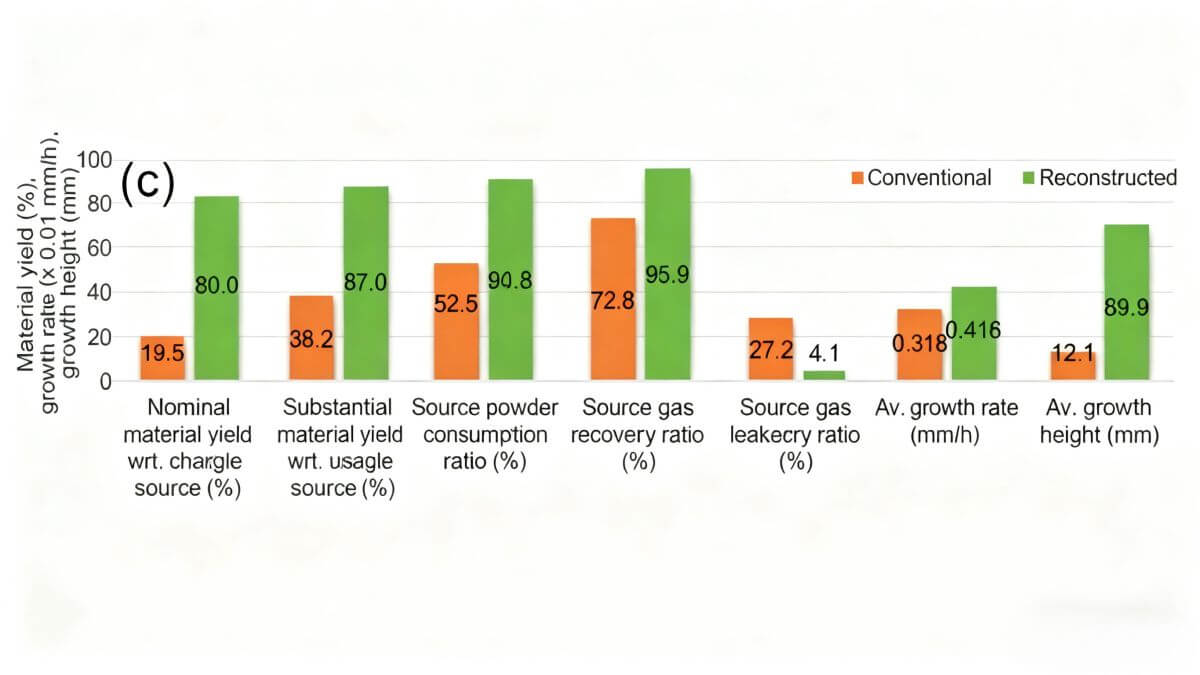 It is widely recognized within the industry that increasing SiC crystal thickness and growth yield is crucial for reducing substrate costs. Although the Physical Vapor Transport (PVT) technique has been developed for decades, the thickness of commercial SiC crystals has remained stagnant at 20–30mm, with limited progress over the past twenty years, constituting a major cost bottleneck hindering the widespread adoption of SiC devices. Beyond relatively low growth rates, the utilization efficiency of SiC source powder being less than 50% is also a significant factor limiting crystal thickness enhancement.