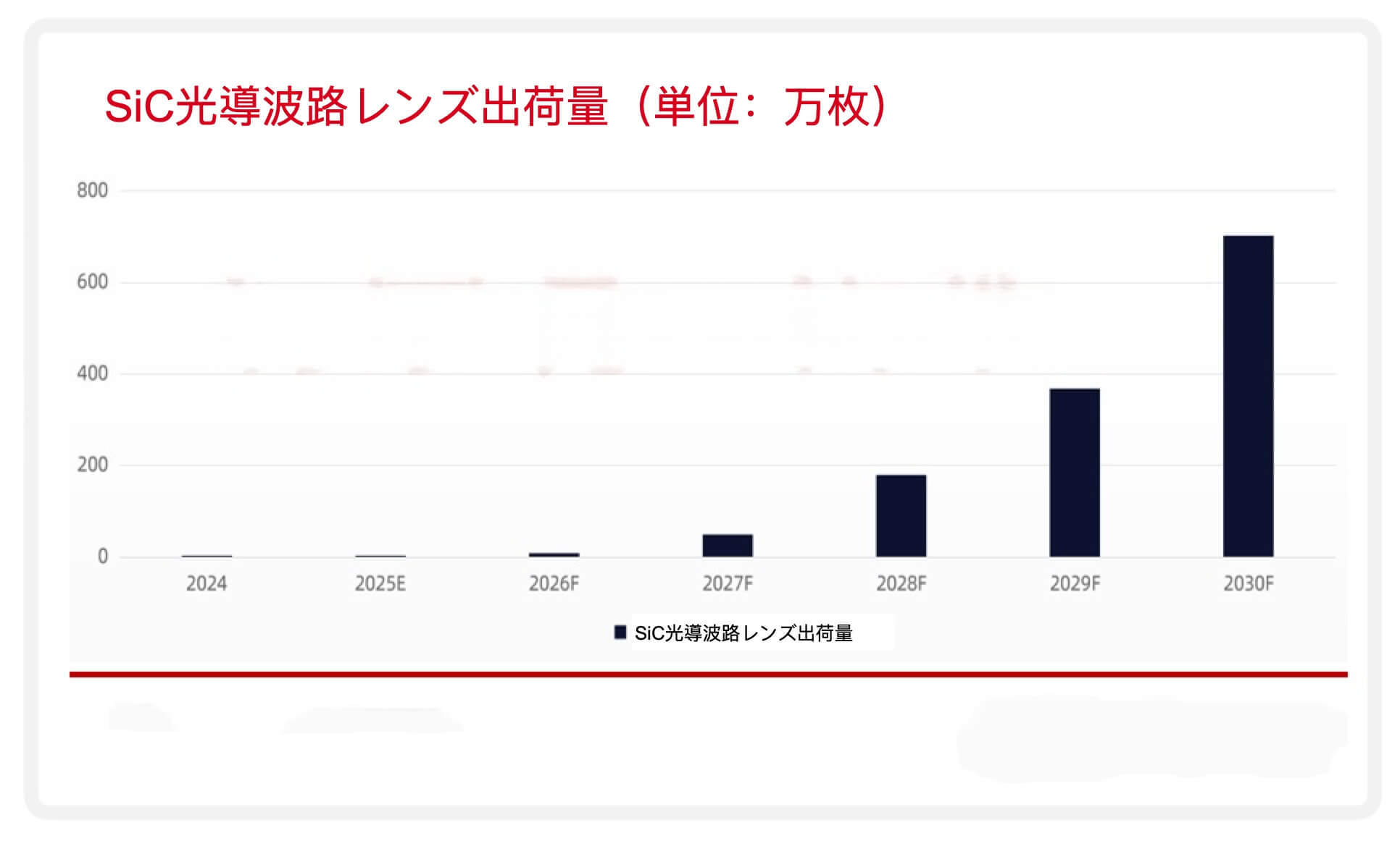 技術の成熟とコスト低下の趨勢を総合的に判断すると、SiC光導波路は量産適用における転換点を迎えたと見なされている。この見解は『2025 AI+ARメガネ光学ディスプレイ調査白書』の予測データによって裏付けられている。同白書によれば、SiC光導波路レンズの出荷量は2027年までに約50万枚に達し、2030年には700万枚に急拡大すると見込まれている。