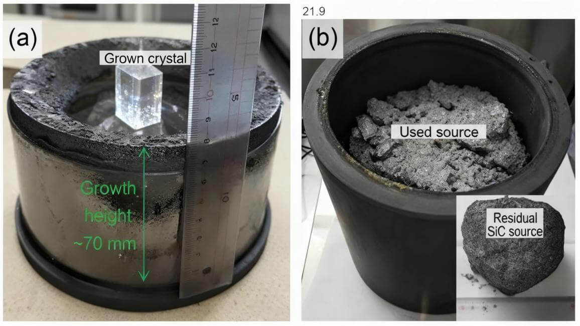 SiC結晶の厚さと成長歩留まりの向上が、基板コスト低減の鍵であることは業界で広く認識されている。物理気相輸送法(PVT)技術は数十年にわたり発展してきたが、市販のSiC結晶の厚さは20~30mmで頭打ち状態が続き、過去20年間でほとんど進展がなく、SiCデバイスの普及を阻む主要なコストボトルネックとなっている。比較的低い成長速度に加え、SiC原料粉末の利用率が50%未満であることも、結晶厚さ向上を制限する重要な要因である。